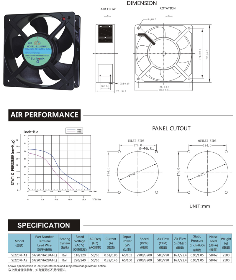 尺寸:205x205x72mm 框架:鋁ADC-12 軸承:雙滾珠軸承 電壓:AC 110V 220V 380V 壽命:60 000Hours at 20℃--滾珠軸承 30 000Hours at 20℃--含油 工作溫度:-20℃~70℃ 正常濕度 儲存溫度:-20℃~85℃ 正常濕度