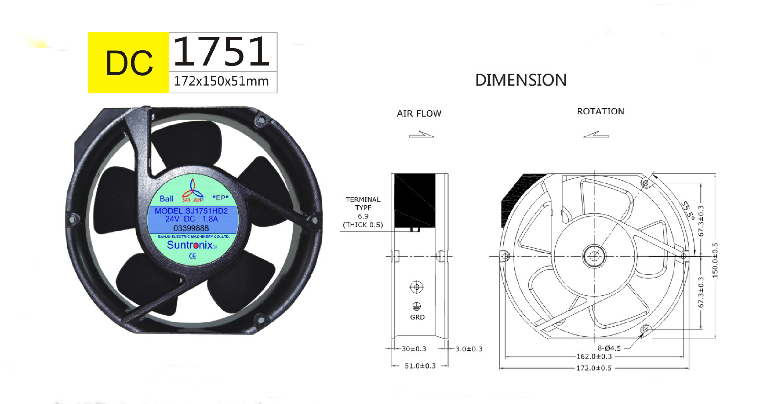 尺寸:172x150x51mm 框架: UL94V-0 PBT 軸承: 含油軸承& 雙滾珠軸承 電壓:DC 5V 12V 24V 48V 壽命:50 000Hours at 25℃--滾珠軸承 30 000Hours at 25℃--含油軸承 工作溫度:-20℃~70℃ 正常濕度 儲存溫度:-20℃~85℃ 正常濕度